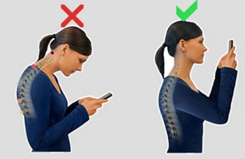 Thói quen nhìn vào điện thoại hàng giờ mỗi ngày khiến đường cong sinh lý của cổ bị đảo ngược, gây nên cơn đau ở cổ và vấn đề ở đĩa đệm. Do đó, cách ngăn ngừa đau cổ mà nhiều người cần chú ý là nên giữ thẳng đầu, nâng điện thoại lên ngang tầm mắt. Trong trường hợp màn hình điện thoại thấp hơn mắt, bạn nên hạ thấp tầm nhìn thay vì cúi đầu. Đồng thời, bạn nên sử dụng 2 tay, 2 ngón cái để gõ ký tự nhằm tạo sự cân đối và vị trí thoải mái hơn cho cột sống.
