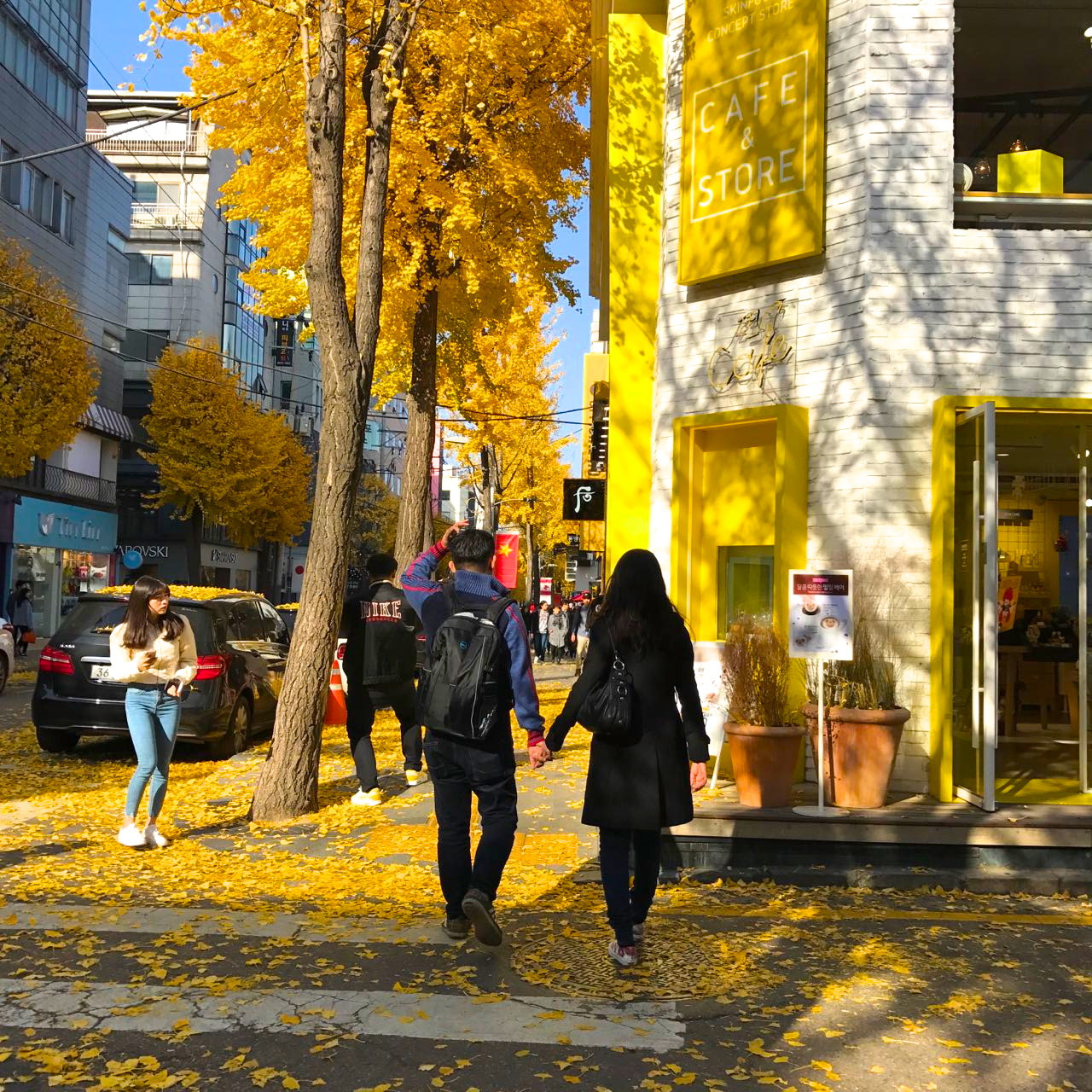 Tản bộ trên đường Garosu-gil: Con đường rợp bóng cây rẻ quạt đầy thơ mộng này nối từ ga Sinsa của tuyến tàu điện ngầm số 3 đến trường trung học Hyeondae. Garosu-gil cũng là con đường "đắt đỏ" có tiếng tại Seoul với nhiều cửa hàng thời trang sang trọng, quán cà phê... được thiết kế xinh đẹp. Tản bộ ở Garosu-gil dưới trời thu, khi lá vàng bắt đầu rơi là trải nghiệm đáng nhớ. Ảnh: Chopsticks & Carryons.