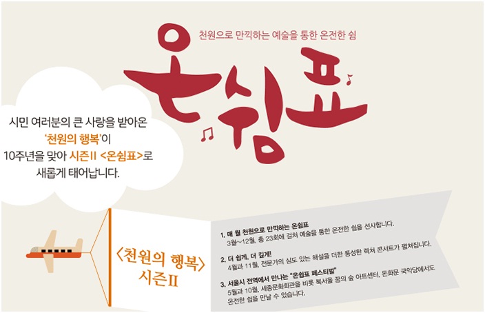 Đây là chương trình khuyến khích người dân tham gia các hoạt động văn hóa “đắt tiền” (vốn chỉ dành cho tầng lớp trung lưu trở lên) như ba lê, nhạc kịch, giao hưởng…Mỗi tháng, trung tâm sẽ tổ chức bốc thăm và trao vé miễn phí cho các thành viên đăng kí nhận vé trên trang web: http://happy1000.sejongpac.or.kr/main/main.asp