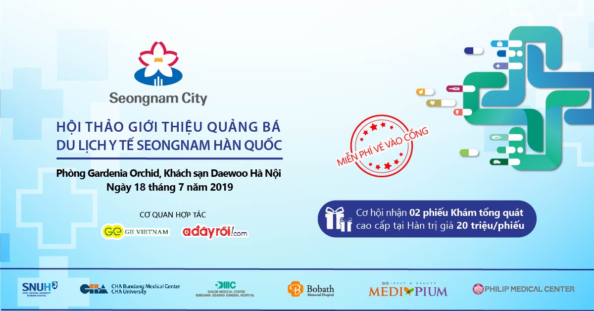 Hội thảo quảng bá Du lịch y tế Seongnam lần này với sự tham gia của 6 bệnh viện hàng đầu thuộc nhiều lĩnh vực khác nhau sẽ giới thiệu những kỹ thuật y tế tiên tiến, những phương pháp điều trị mới, những dịch vụ y tế tiêu chuẩn cao trên thế giới cùng với cái nhìn toàn cảnh về Du lịch y tế.