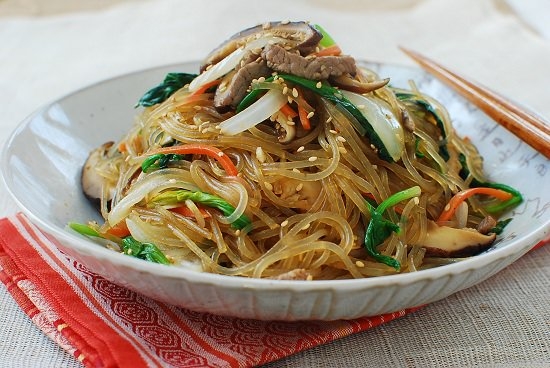 Đây là món miến xào Hàn Quốc, nguyên liệu để làm món này cực kì đơn giản. Chỉ gồm các loại rau theo mùa và thịt. Người Hàn Quốc có thói quen hoặc là do truyền thống, món ăn nào có thể họ đều cho vừng lên món ăn sau đi hoàn thành. Món này đùng dầu mè để xào, xì dầu, ớt và hạt vừng.