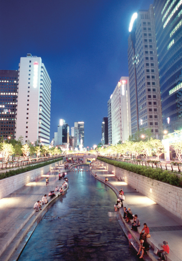 Bên cạnh đường Jongno là suối Cheonggyecheon. Dòng suối này đã được hoàn thành cải tạo, khôi phục vào năm 2005, khoác lên mình một diện mạo hoàn toàn mới. Trong quá khứ, các bà và mẹ thường ra suối này để giặt quản áo. Nhưng từ khi phát triển thành phố cuối những năm 1950, con suối này đã bị lấp đi và phía trên nó, những cây cầu vượt mọc lên. Cây cầu vượt được xây trên suối được xem là một biểu tượng cho sự hiện đại hóa của Hàn Quốc. Tuy nhiên, cây cầu vượt bê tông cốt thép này đã bị phá hủy trong dự án khôi phục dòng suối. Hiện nay, một dòng suối nhân tạo chạy dọc con đường mòn cũ tạo thành một không gian sinh thái tự nhiên nơi thực vật thủy sinh phát triển.