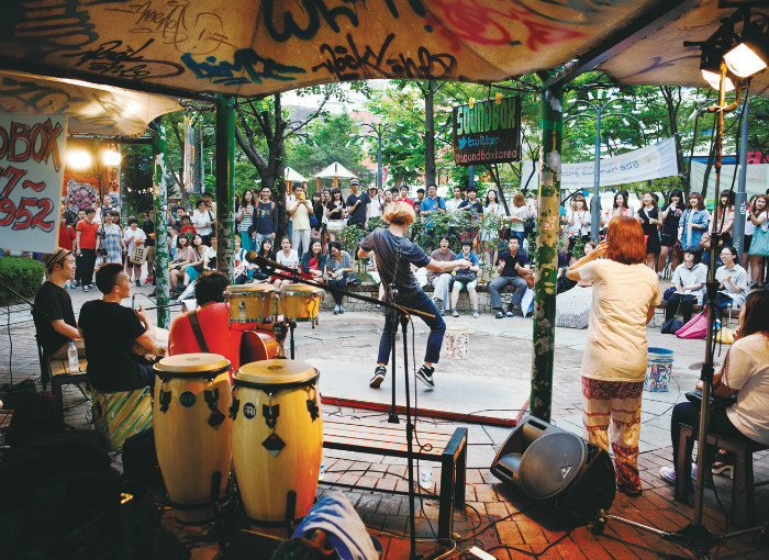sống biểu diễn nhiều dòng nhạc đa dạng như rock, punk và techno. Ngoài ra, mỗi tối ở Hongdae đều có các buổi biểu diễn đường phố được tổ chức một cách liên tục, và con đường thì không khi nào ngớt bước chân của những người trẻ tuổi, bao gồm cả sinh viên và người đi làm.