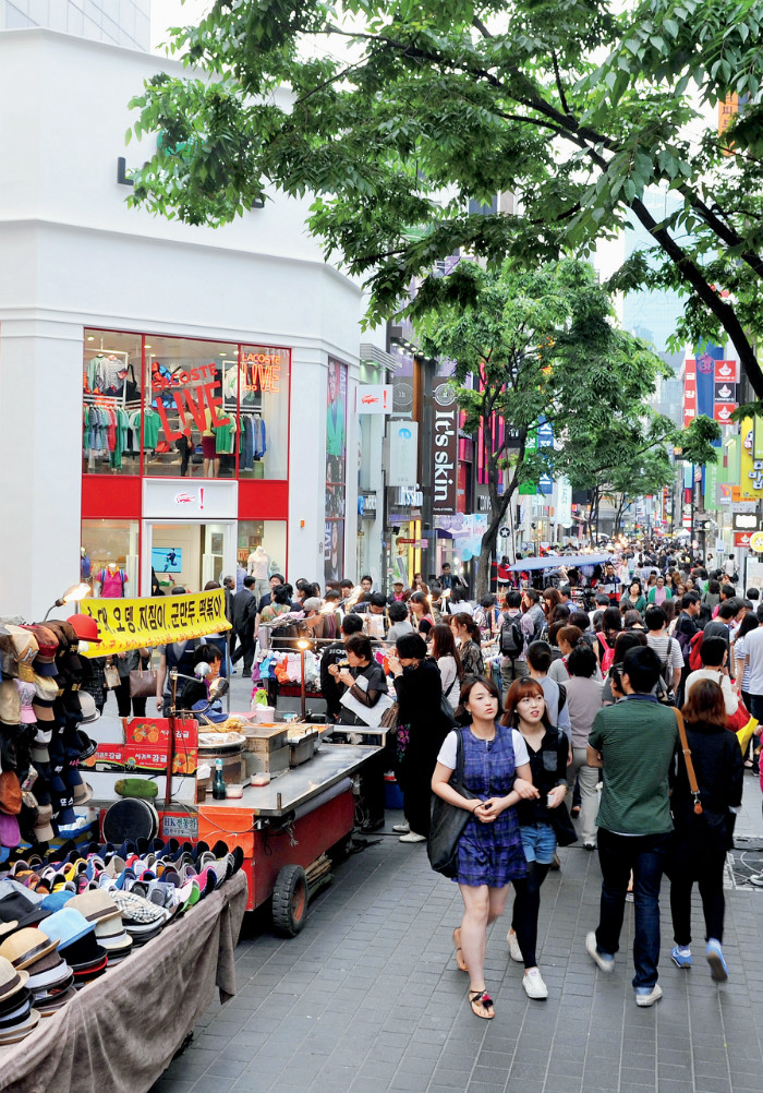 Myeongdong được coi là thánh địa mua sắm. Các cửa hàng quần áo, mỹ phẩm, giày dép, phụ kiện và quà lưu niệm mọc lên dày đặc. Myeongdong đã trở thành trung tâm thương mại, tài chính và văn hóa tại Seoul kế từ sau chiến tranh Triều Tiên.